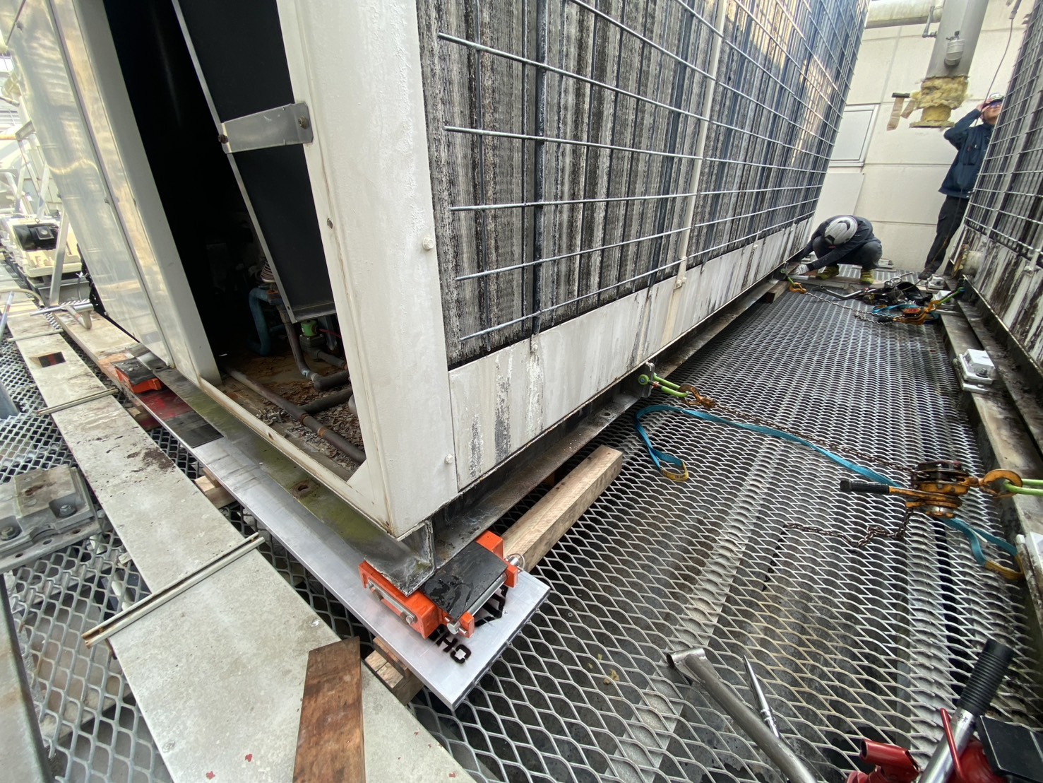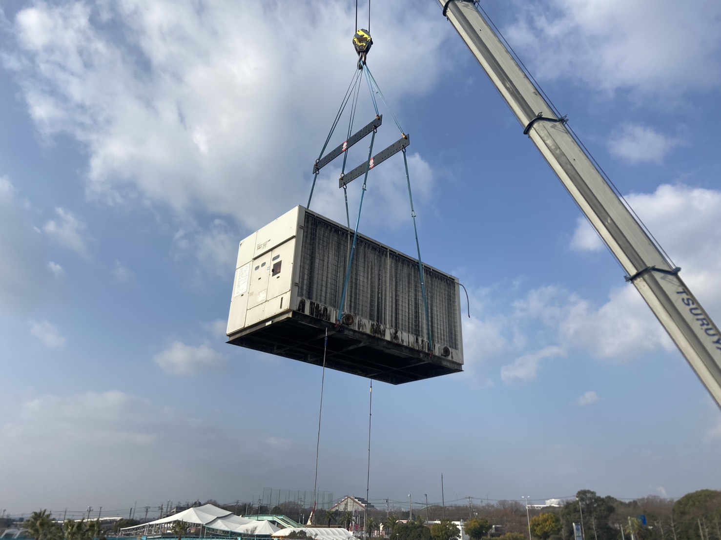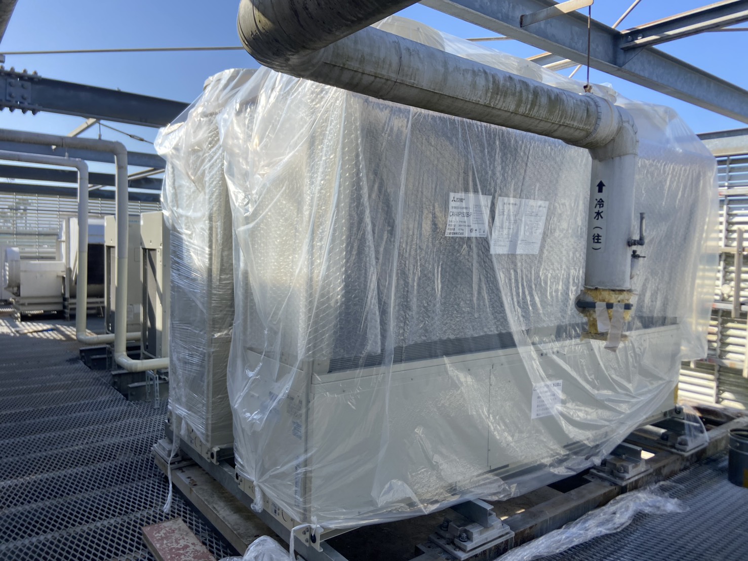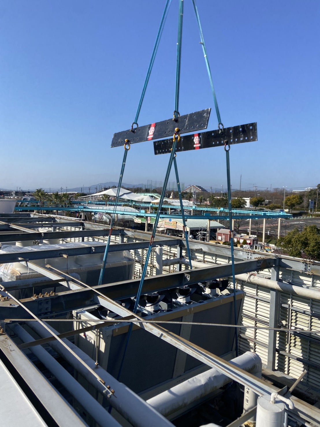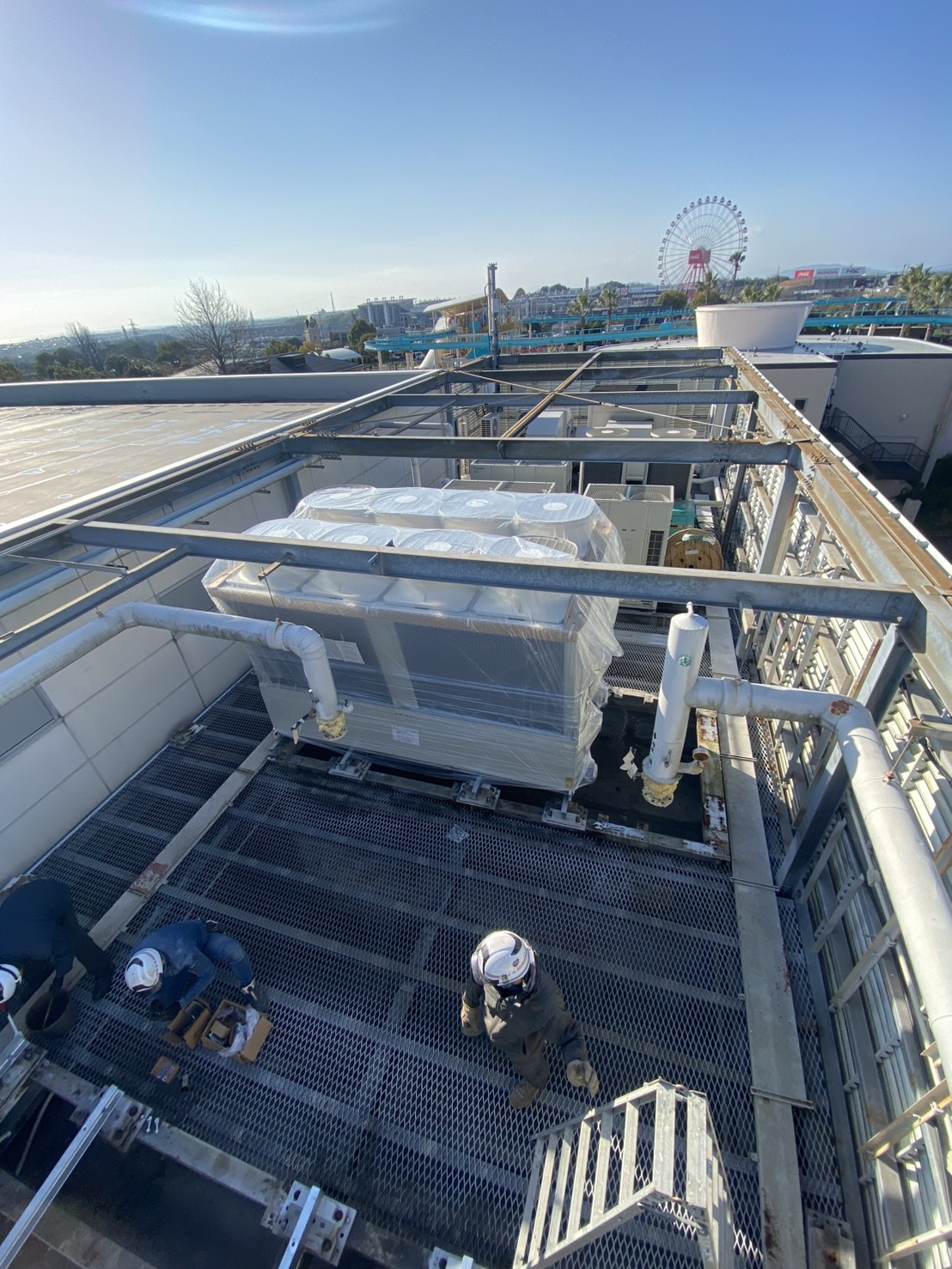 三重県内某遊園地にて、既設チリングユニットの更新工事を実施しました。屋上設置のため、クレーンによる慎重な揚重作業を行い、安全対策を徹底。既存配管・架台との取り合いを確認しながら、精度の高い据付施工を実施しました。営業施設のため、工程管理を徹底し、来園者への影響を最小限に抑えて施工。安定した冷却能力を確保し、施設の快適環境を支える設備更新を完了しました。