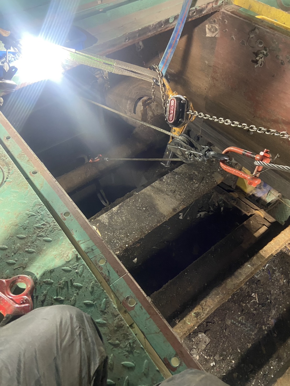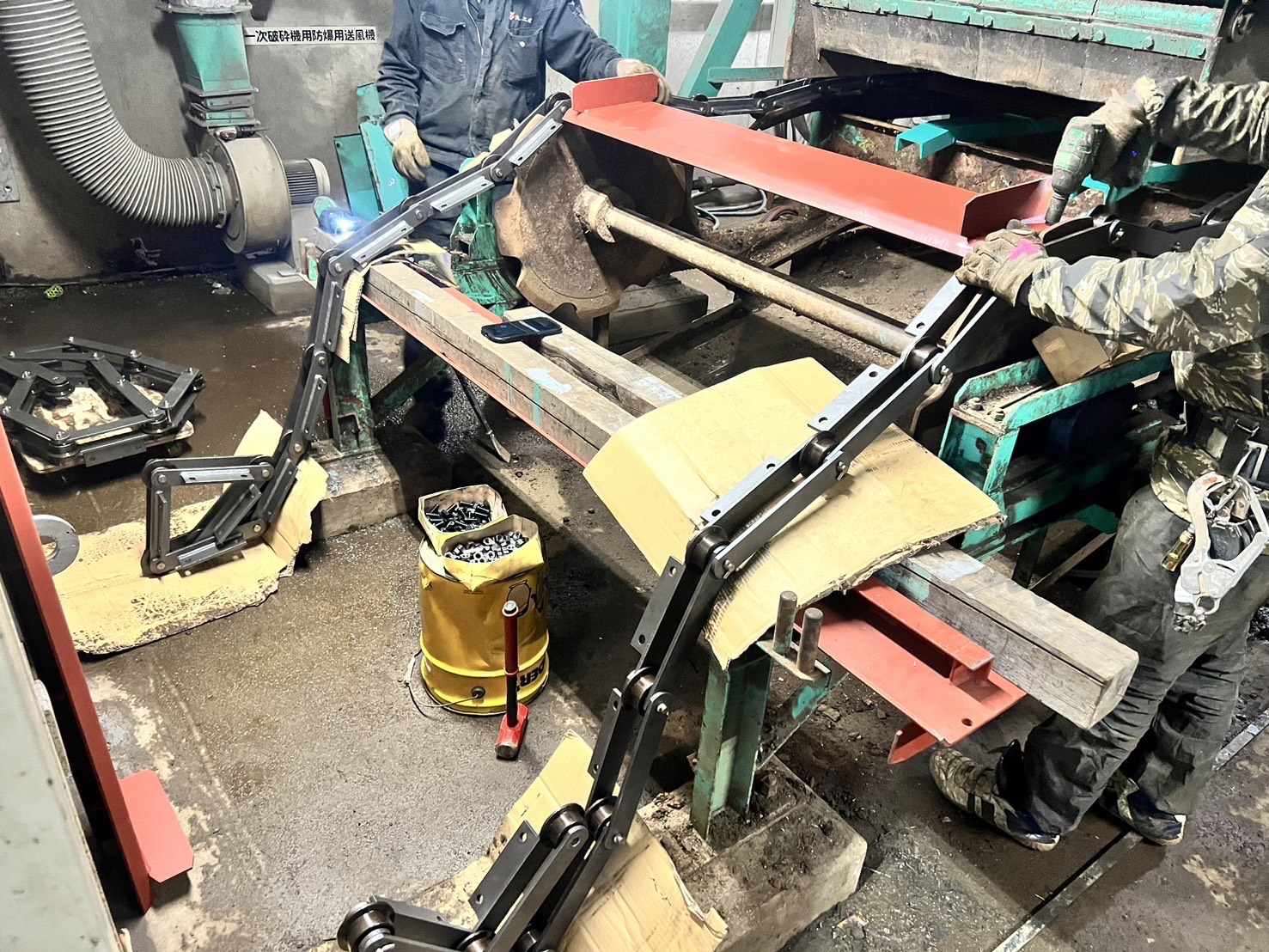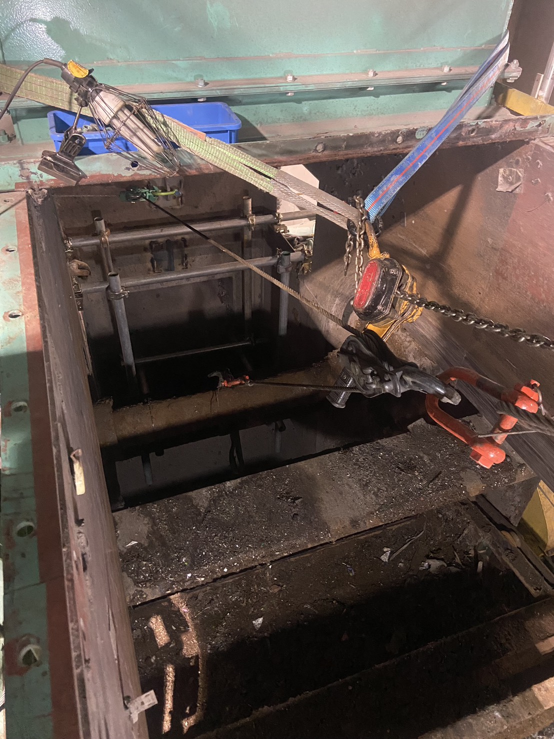 某ゴミ処理場にてチェーンコンベア更新工事を実施しました。既設設備の解体・撤去後、新規コンベアの据付を行いました。狭所かつ重量物作業のため、安全管理を徹底して施工。溶断・調整を行いながら精度の高い組立を実現しました。搬送機能の安定化と設備の長寿命化に貢献しています。