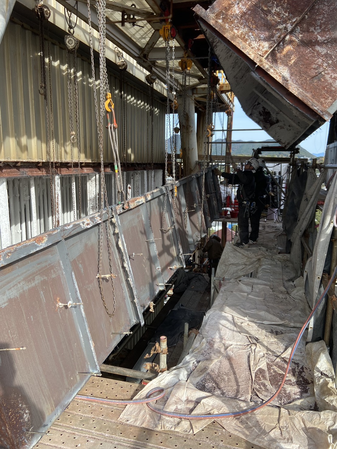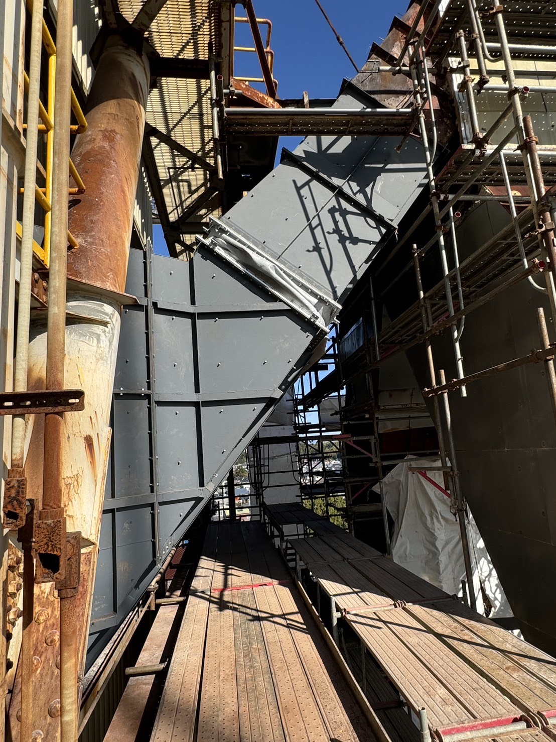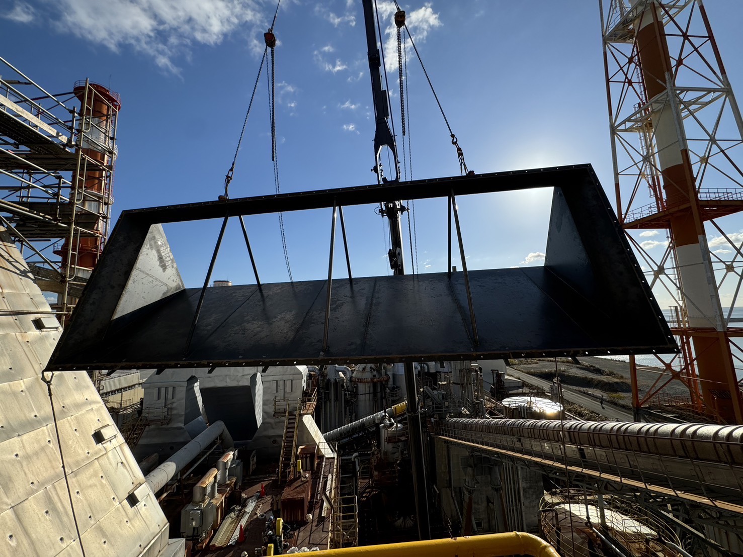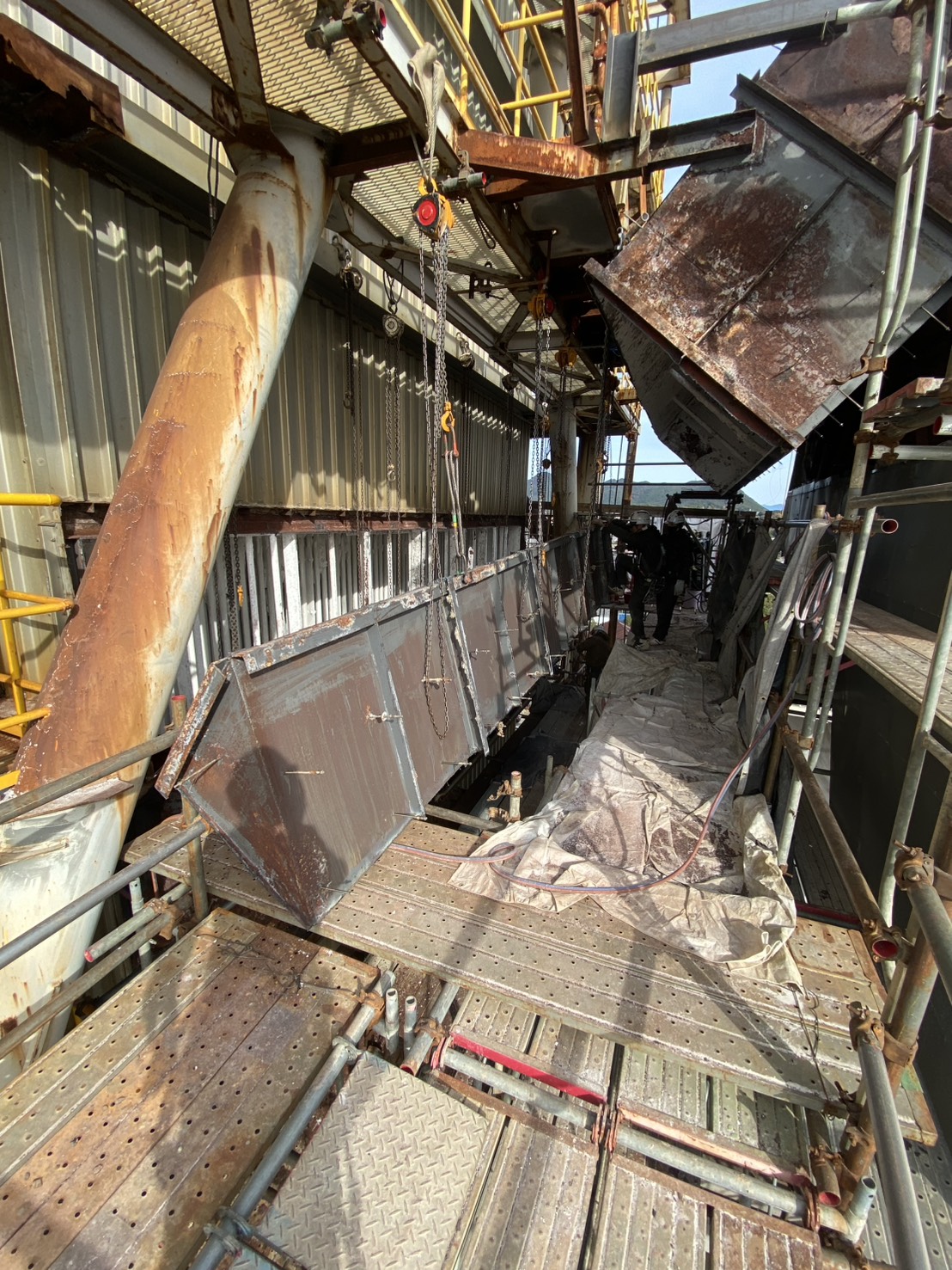 角ダクト更新工事を実施しました。老朽化した既存ダクトを撤去し、新規ダクトへ更新。狭所かつ高所での作業のため、安全対策を徹底して施工。現地状況に合わせた精度の高い据付・接続を行いました。設備の機能性・耐久性を向上させ、安定稼働に貢献しています。