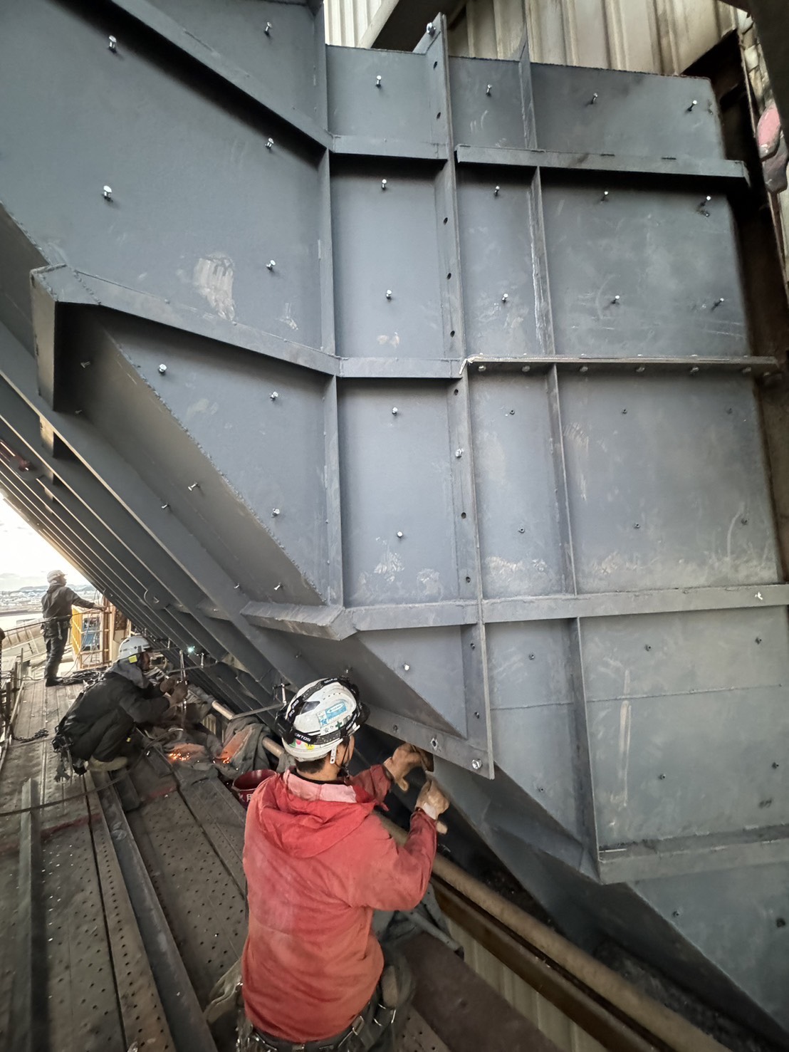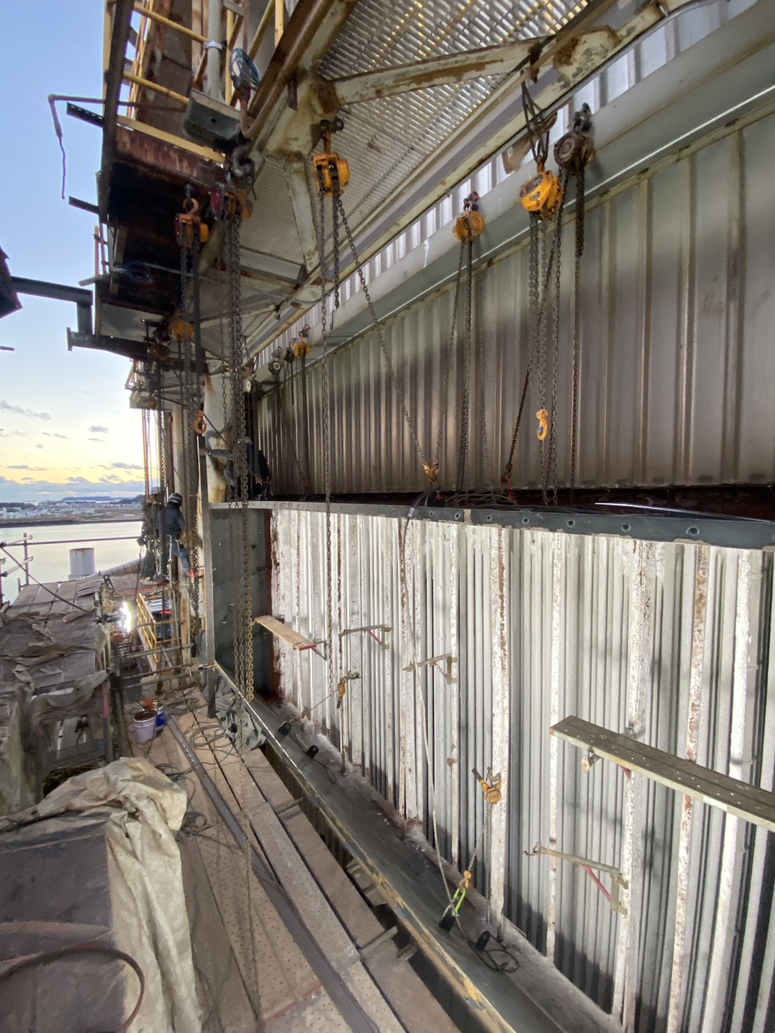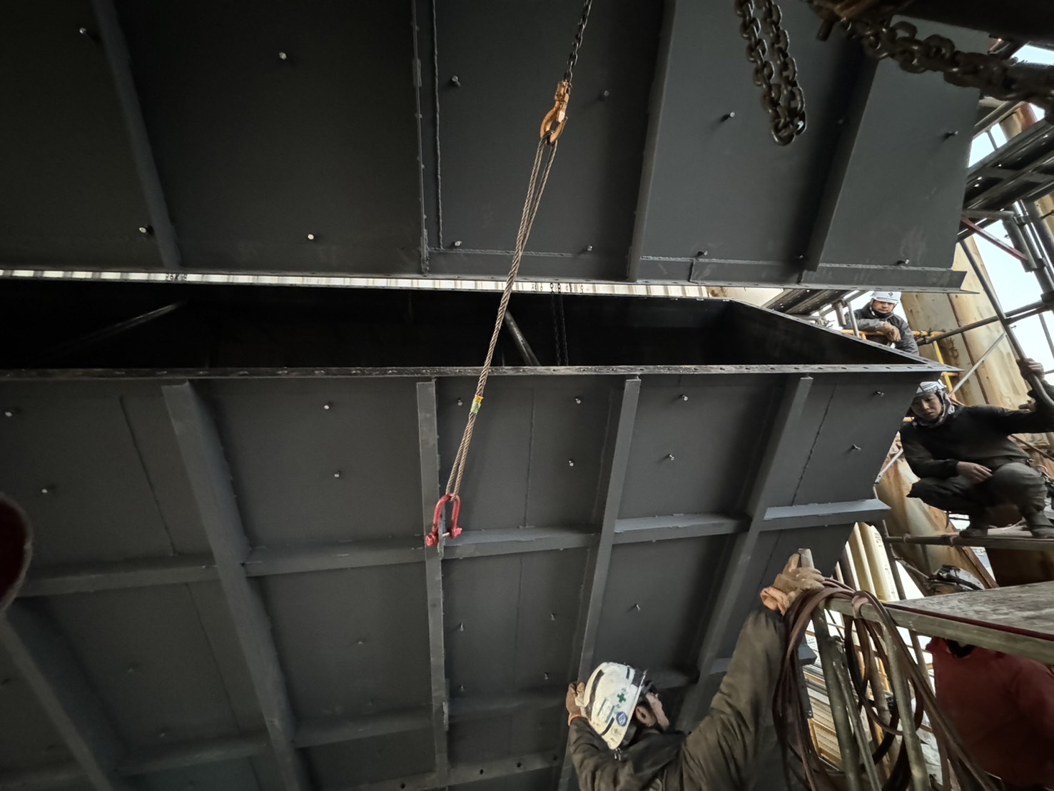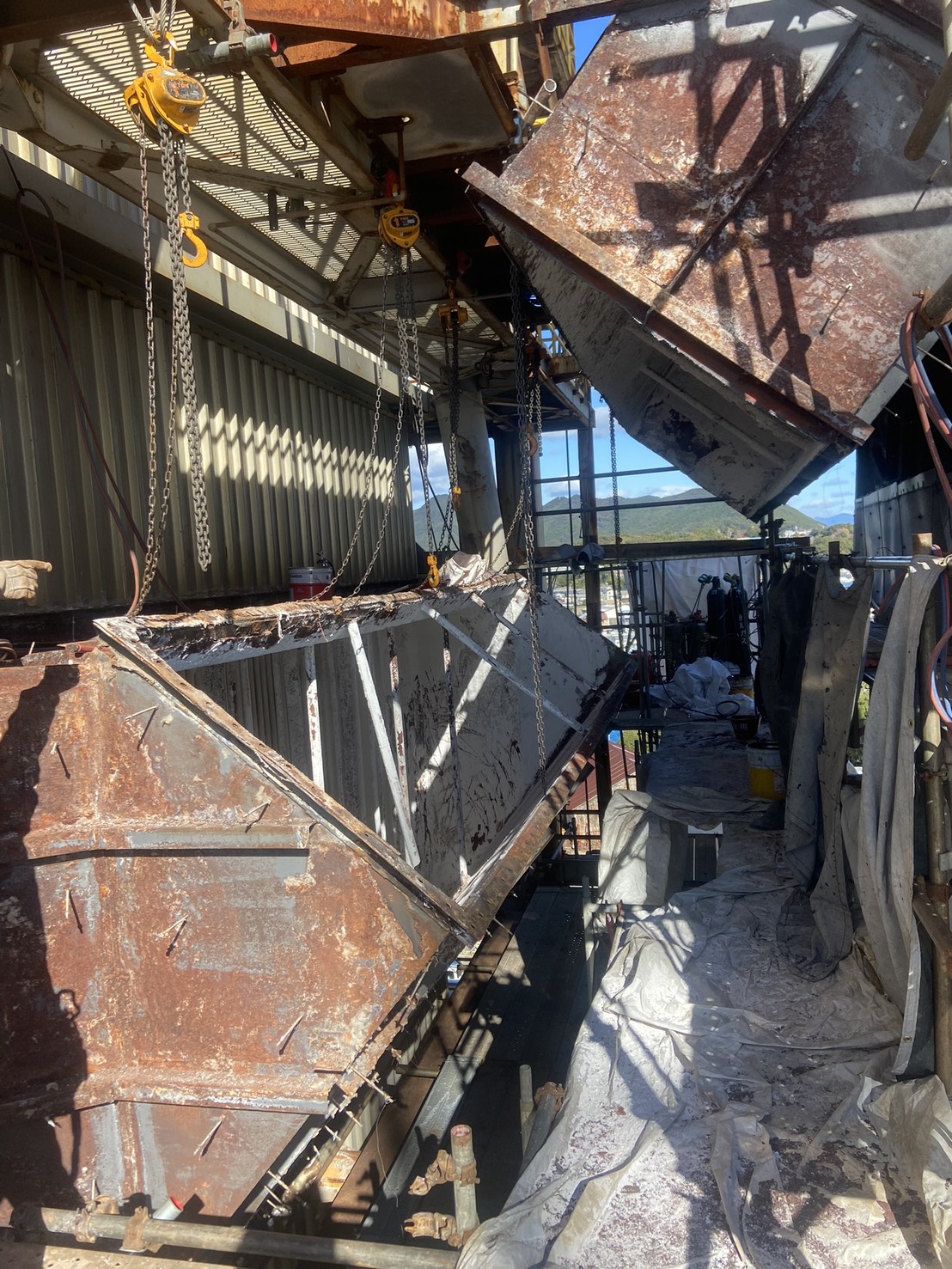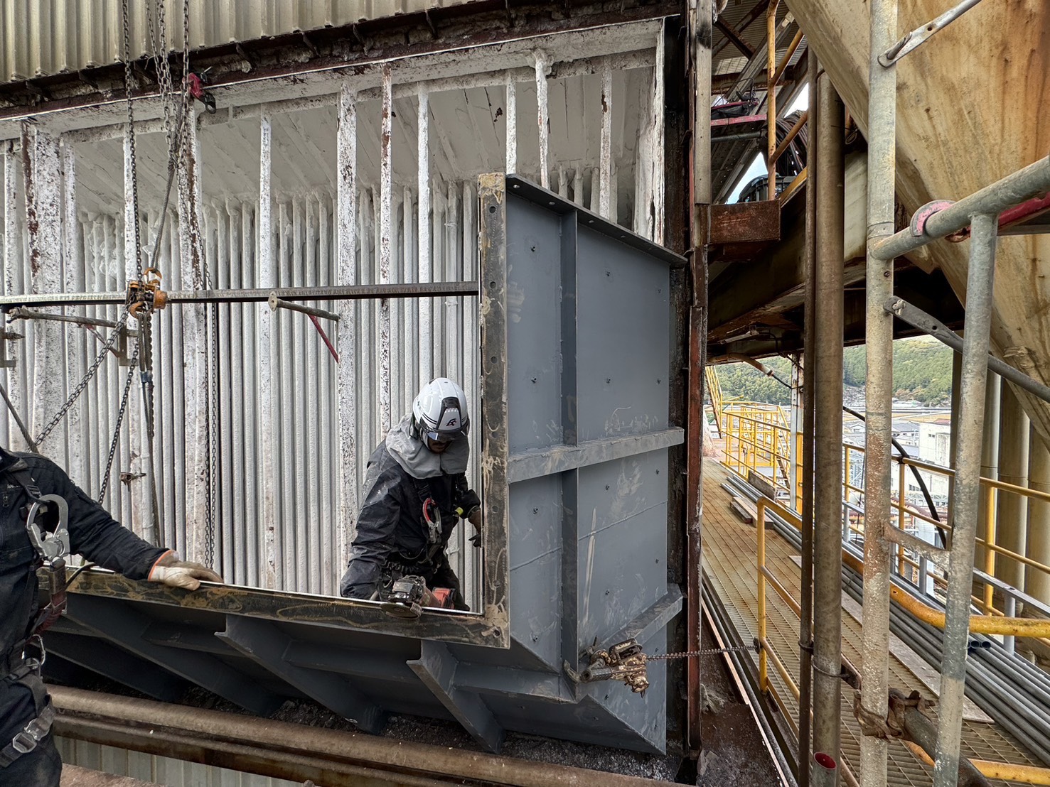 角ダクト更新工事を実施しました。老朽化した既存ダクトを撤去し、新規ダクトへ更新。狭所かつ高所での作業のため、安全対策を徹底して施工。現地状況に合わせた精度の高い据付・接続を行いました。設備の機能性・耐久性を向上させ、安定稼働に貢献しています。